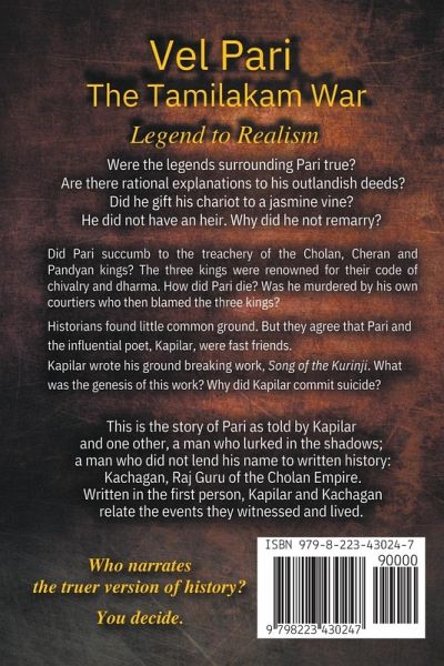 Vel Pari: The Tamilakam War. Legend to Realism. Were the legends surrounding Pari true? Are there rational explanations to his outlandish deeds? Did he gift his chariot to a jasmine vine? He did not have an heir. Why did he not remarry? Did Pari succumb to the treachery of the Cholan, Cheran and Pandyan kings? The three kings were renowned for their code of chivalry and dharma. How did Pari die? Was he murdered by his own courtiers who then blamed the three kings? Historians found little common ground. But they agree that Pari and the influential poet, Kapilar, were fast friends. Kapilar wrote his ground breaking work, Song of the Kurinji. What was the genesis of this work? Why did Kapilar commit suicide? This is the story of Pari as told by Kapilar and one other, a man who lurked in the shadows; a man who did not lend his name to written history: Kachagan, Raj Guru of the Cholan Empire. Written in the first person, Kapilar and Kachagan relate the events they witnessed and lived. Who narrates the truer version of history? You decide.