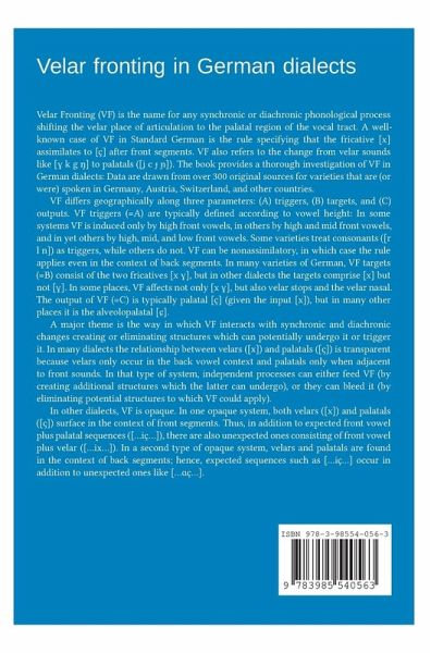 Velar Fronting (VF) is the name for any synchronic or diachronic phonological process shifting the velar place of articulation to the palatal region of the vocal tract. A well-known case of VF in Standard German is the rule specifying that the fricative [x] assimilates to [ç] after front segments. VF also refers to the change from velar sounds like [¿ k g ¿] to palatals ([¿ c ¿ ¿]). The book provides a thorough investigation of VF in German dialects: Data are drawn from over 300 original sources for varieties that are (or were) spoken in Germany, Austria, Switzerland, and other countries. VF differs geographically along three parameters: (A) triggers, (B) targets, and (C) outputs. VF triggers (=A) are typically defined according to vowel height: In some systems VF is induced only by high front vowels, in others by high and mid front vowels, and in yet others by high, mid, and low front vowels. Some varieties treat consonants ([r l n]) as triggers, while others do not. VF can be nonassimilatory, in which case the rule applies even in the context of back segments. In many varieties of German, VF targets (=B) consist of the two fricatives [x ¿], but in other dialects the targets comprise [x] but not [¿]. In some places, VF affects not only [x ¿], but also velar stops and the velar nasal. The output of VF (=C) is typically palatal [ç] (given the input [x]), but in many other places it is the alveolopalatal [¿]. A major theme is the way in which VF interacts with synchronic and diachronic changes creating or eliminating structures which can potentially undergo it or trigger it. In many dialects the relationship between velars ([x]) and palatals ([¿]) is transparent because velars only occur in the back vowel context and palatals only when adjacent to front sounds. In that type of system, independent processes can either feed VF (by creating additional structures which the latter can undergo), or they can bleed it (by eliminating potential structures to which VF could apply). In other dialects, VF is opaque. In one opaque system, both velars ([x]) and palatals ([¿]) surface in the context of front segments. Thus, in addition to expected front vowel plus palatal sequences ([¿iç¿]), there are also unexpected ones consisting of front vowel plus velar ([¿ix¿]). In a second type of opaque system, velars and palatals are found in the context of back segments; hence, expected sequences such as [¿iç¿] occur in addition to unexpected ones like [¿¿ç¿].