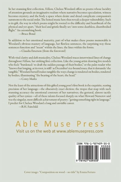 Chelsea Woodard’s Vellum, a finalist for the 2013 Able Muse Book Award, propels the reader along new paths of discovery in the quotidian as in the mythical. Its scope is far-ranging: a flower press received as a gift in childhood, Tarot reading with a favorite aunt, unexpected reflections at a tattoo parlor, reminiscing about an old flame, the discovery of rare volumes at the local library, or auctioning off old toys on eBay. Woodward’s insights and sensibilities in the visual and performing arts are deftly realized in fine or broad strokes-as in "Coppélia," "The Painter and the Color-blind," "Degas’s Nudes," or as in "Still Life," which muses that "It’s difficult/ to give back life/ to what’s been cut off from the living." Stories and scenes represented in popular artwork are reimagined in ekphrastics such as "Self Portrait as the Allegory of Painting." With excursions into the surreal, myth is made, lived or remade, as in "Philomela," "Pegasus" and "The Feral Child." This is an exquisite debut collection that rewards the mind and senses with its formal impetus and deft musicality, its precise and lively language, its emotional compass. PRAISE FOR VELLUM: In her stunning first collection, Vellum, Chelsea Woodard offers us poems whose lucidity of attention grounds an imaginative realism where narrative becomes speculation, witness becomes mystery, and the body a space where desire and dread complicate compassion’s summons to the social order. The honed music here thus reveals a deeper vulnerability. Such is its gift, the way in which poems might be rooted to the difficulty and heartbreak of the physical and yet apart, "their keel and gristle finally set/ into some deathless, disembodied flight." An astonishing book. -Bruce Bond In addition to her emotional maturity, part of what makes these poems memorable is Woodard's obvious mastery of language, her flawless sentences, the surprising way those sentences function and "mean" within the lines, the lines within the forms. -Claudia Emerson (from the foreword) Not the least of the attractions of this gifted young poet's first book is the exquisite, searing precision of her language-the obsessively exact diction; the tropes that map with such stunning accuracy the emotional contours of her narratives; the gestural, almost tactile quality of her syntax-all of these talents focused sharply on what Howard Nemerov said was the singular, most difficult achievement of poetry: "getting something right in language." I predict for Chelsea Woodard a long and enviable career. -B.H. Fairchild ABOUT THE AUTHOR: Chelsea Woodard received her MFA from the Johns Hopkins University and her PhD from the University of North Texas. She earned a BA in Visual Arts and English from Union College. Her poems have appeared in The Threepenny Review, Southwest Review, Best New Poets, Blackbird, 32 Poems and other journals. She currently teaches in New Hampshire where she lives with her husband, Pete. Vellum was a finalist for the 2013 Able Muse Book Award.
