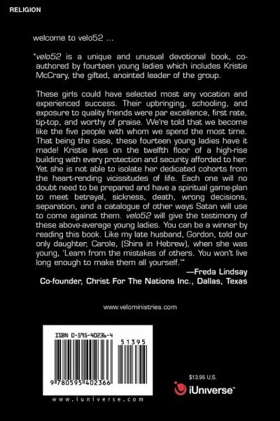 velo52 is a unique and unusual devotional book, co-authored by fourteen young ladies which includes Kristie McCrary, the gifted, anointed leader of the group. These girls could have selected most any vocation and experienced success. Their upbringing, schooling, and exposure to quality friends were par excellence, first rate, tip-top, and worthy of praise. We're told that we become like the five people with whom we spend the most time. That being the case, these fourteen young ladies have it made! Kristie lives on the twelfth floor of a high-rise building with every protection and security afforded to her. Yet she is not able to isolate her dedicated cohorts from the heart-rending vicissitudes of life. Each one will no doubt need to be prepared and have a spiritual game-plan to meet betrayal, sickness, death, wrong decisions, separation, and a catalogue of other ways Satan will use to come against them. velo52 will give the testimony of these above-average young ladies. You can be a winner by reading this book. Like my late husband, Gordon, told our only daughter, Carole, (Shira in Hebrew), when she was young, 'Learn from the mistakes of others. You won't live long enough to make them all yourself.'" Freda Lindsay Co-founder, Christ For The Nations Inc., Dallas, Texas