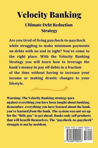 How to shave years off your mortgage and credit card debt without big lifestyle changes. Forget everything you think you know about banking and personal finances. With just a few changes in your banking habits, you can be on your way to living a debt-free life. Velocity Bankingis a debt reduction strategy used to rapidly pay off high interest debt without having to increase your current income and without making drastic changes to your lifestyle. The strategy works well for those who either have a hard time saving money or those who have little savings to begin with. Velocity Banking will help you understand why our current system of banking is inefficient, outdated, and set up by big banks to keep the little guy living paycheck-to-paycheck. Just look around you, everyone seems to be stuck in the same "trading time for money" mindset while treading in an endless sea of debt.