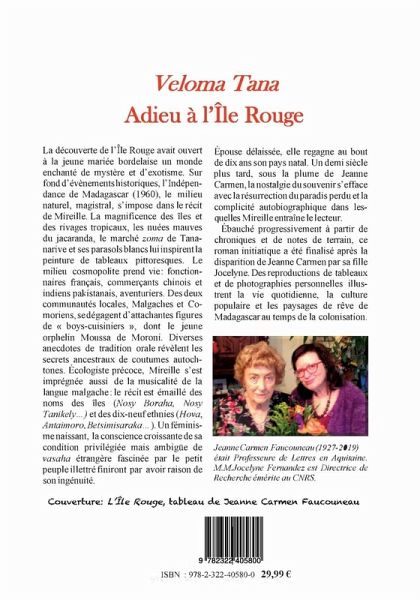 Née en 1927 à Bordeaux, Jeanne Carmen Faucouneau part en 1955 avec son époux radiologue à Madagascar, où elle connaîtra différentes expériences professionnelles audacieuses. Dix ans plus tard, après l'Indépendance du pays, elle rentre seule en France et reprend ses études. Diplômée de géographie et d'espagnol, elle exercera jusqu'à sa retraite les fonctions de Professeure de Lettres dans un collège du Bassin d'Arcachon. Hantée par les souvenirs de son exotique aventure de jeunesse, Carmen construit au fil des années autour de son Journal de bord un récit destiné à devenir, avec la collaboration tardive de sa fille chercheuse au CNRS, un roman initiatique de l'époque de la colonisation. Jocelyne achèvera cette oeuvre après la disparition soudaine de sa mère en 2019, et l'assortira de nombreuses illustrations, dont les tableaux peints par la voyageuse.