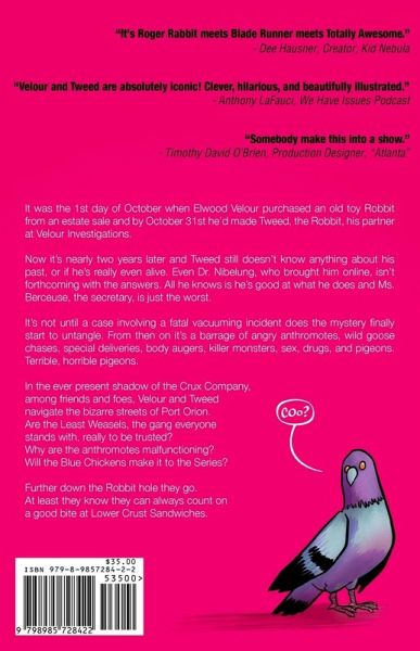 It was the 1st day of October when Elwood Velour purchased an old toy Robbit from an estate sale and by October 31st he'd made Tweed, the Robbit, his partner at Velour Investigations. Now it's nearly two years later and Tweed still doesn't know anything about his past, or if he's really even alive. Even Dr. Nibelung, who brought him online, isn't forthcoming with the answers. All he knows is he's good at what he does and Ms. Berceuse, the secretary, is just the worst. It's not until a case involving a fatal vacuuming incident does the mystery finally start to untangle. From then on it's a barrage of angry anthromotes, wild goose chases, special deliveries, body augers, killer monsters, sex, drugs, and pigeons. Terrible, horrible pigeons. In the ever present shadow of the Crux Company, among friends and foes, Velour and Tweed navigate the bizarre streets of Port Orion. Are the Least Weasels, the gang everyone stands with, really to be trusted? Why are the anthromotes malfunctioning? Will the Blue Chickens Make it to the Series? Further down the Robbit hole they go. At least they know they can always count on a good bite at Lower Crust Sandwiches.