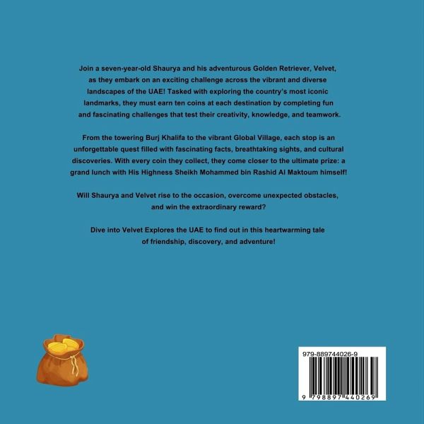 Join a seven-year-old Shaurya and his adventurous Golden Retriever, Velvet, as they embark on an exciting challenge across the vibrant and diverse landscapes of the UAE! Tasked with exploring the country's most iconic landmarks, they must earn 10 coins at each destination by completing fun and fascinating challenges that test their creativity, knowledge, and teamwork. From the towering Burj Khalifa to the vibrant Global Village, each stop is an unforgettable quest filled with fascinating facts, breathtaking sights, and cultural discoveries. With every coin they collect, they come closer to the ultimate prize: a grand lunch with His Highness Sheikh Mohammed bin Rashid Al Maktoum himself! Will Shaurya and Velvet rise to the occasion, overcome unexpected obstacles, and win the extraordinary reward? Dive into Velvet Explores the UAE to find out in this heartwarming tale of friendship, discovery, and adventure.