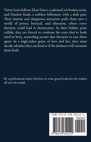 Velvet Scars follows Elara Vance, a talented yet broken artist, and Damien Kade, a ruthless billionaire with a dark past. Their intense and dangerous attraction pulls them into a world of power, betrayal, and obsession, where every decision could lead to destruction. As their hidden pasts collide, they are forced to confront the scars they've both tried to bury, unraveling secrets that threaten to tear them apart. In a high-stakes game of love and lies, they must decide whether they can heal or if the darkness will consume them both.