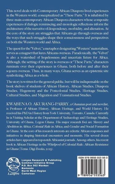 This novel deals with Contemporary African Diaspora lived-experiences in the Western world, conceptualized as "These Parts." It is inhabited by three main contemporary African Diaspora characters whose composite experiences of dialogic reminiscing and monologic reflections inform the architecture of the narrative of despondency, morbidity, and alienation. At the core of the story are struggles that Africans go through overseas and the ways that such struggles shape their consciousness and perspectives on both the Western world and Africa The quest for the "Velvet." a metaphor designating "Western" materialism serves as a magnet that lures Africans overseas. Paradoxically. the "Velvet is also a watershed of hopelessness and uncertain future for Africa. Although, the setting of the story is overseas or "These Parts." characters ruminate over their experiences in Ghana, both before and after their sojourn overseas. Thus, in many ways, Ghana serves as an epistemic site symbolizing Africa as a whole The story is written for the general public, but will be indispensable on the book shelves of students of African History, African Studies, Diaspora Studies, Hegemony and the Postcolonial Studies, Heritage Studies. Cultural Studies, and Migration and Transnational Studies.