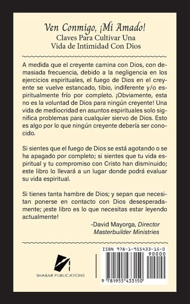 Ven Conmigo, ¡Mi Amado! Por David Mayorga A medida que el creyente camina con Dios, con demasiada frecuencia, debido a la negligencia en los ejercicios espirituales, el fuego de Dios en el creyente se vuelve estancado, tibio, indiferente y/o espiritualmente frío por completo. ¡Obviamente, esta no es la voluntad de Dios para ningún creyente! Una vida de mediocridad en asuntos espirituales solo significa problemas para cualquier siervo de Dios. Esto es algo por lo que ningún creyente debería ser conocido. Si sientes que el fuego de Dios se está agotando o se ha apagado por completo; si sientes que tu vida espiritual y tu compromiso con Cristo han disminuido; este libro lo llevará a un lugar donde podrá evaluar su vida espiritual. En este libro, Vente Conmigo, ¡Mi Amado!, David Mayorga, desafía al lector a evaluar y hacer los cambios necesarios, cambios de actitud, de hábitos, de disciplina, etc. El fuego de Dios sólo cesa por el descuido, ¡nada más! Si tienes tanta hambre de Dios; y sepan que necesitan ponerse en contacto con Dios desesperadamente; ¡este libro es lo que necesitas estar leyendo actualmente! ¡Disfruta el viaje mientras eres transformado por Su Espíritu!