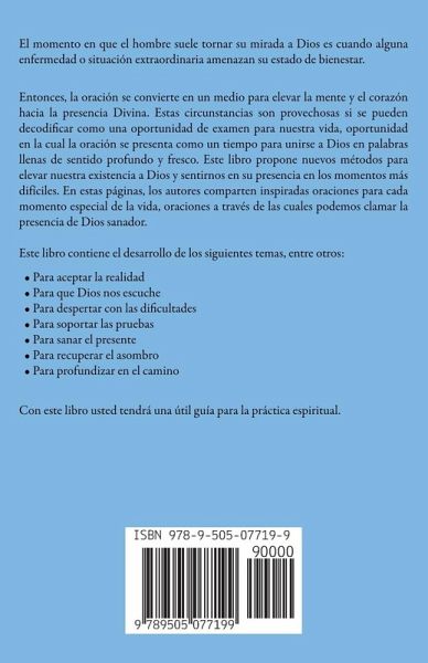 El momento en que el hombre suele tornar su mirada a Dios es cuando alguna enfermedad o situación extraordinaria amenazan su estado de bienestar. Entonces, la oración se convierte en un medio para elevar la mente y el corazón hacia la presencia Divina. Estas circunstancias son provechosas si se pueden decodificar como una oportunidad de examen para nuestra vida, oportunidad en la cual la oración se presenta como un tiempo para unirse a Dios en palabras llenas de sentido profundo y fresco. Este libro propone nuevos métodos para elevar nuestra existencia a Dios y sentirnos en su presencia en los momentos más difíciles. En estas páginas, los autores comparten inspiradas oraciones para cada momento especial de la vida, oraciones a través de las cuales podemos clamar la presencia de Dios sanador. Este libro contiene el desarrollo de los siguientes temas, entre otros:Para aceptar la realidad Para que Dios nos escuche Para despertar con las dificultades Para soportar las pruebas Para sanar el presente Para recuperar el asombro Para profundizar en el camino Con este libro usted tendrá una útil guía para la práctica espiritual.