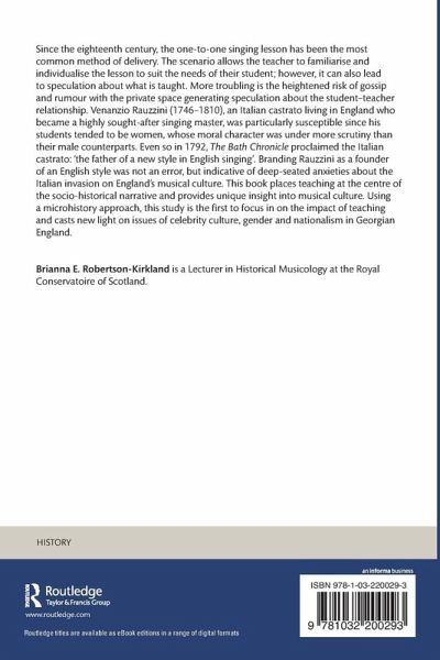 Since the eighteenth century, the one-to-one singing lesson has been the most common method of delivery. The scenario allows the teacher to familiarise and individualise the lesson to suit the needs of their student; however, it can also lead to speculation about what is taught. More troubling is the heightened risk of gossip and rumour with the private space generating speculation about the student-teacher relationship. Venanzio Rauzzini (1746-1810), an Italian castrato living in England who became a highly sought-after singing master, was particularly susceptible since his students tended to be women, whose moral character was under more scrutiny than their male counterparts. Even so in 1792, The Bath Chronicle proclaimed the Italian castrato: 'the father of a new style in English singing'. Branding Rauzzini as a founder of an English style was not an error, but indicative of deep-seated anxieties about the Italian invasion on England's musical culture. This book places teaching at the centre of the socio-historical narrative and provides unique insight into musical culture. Using a microhistory approach, this study is the first to focus in on the impact of teaching and casts new light on issues of celebrity culture, gender and nationalism in Georgian England.