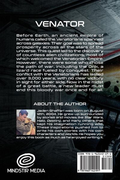 Before Earth, an ancient empire of humans called the Venatorians spanned across galaxies. Their goal was to spread prosperity across all the stars of the universe. This quest led to the discovery of countless alien civilizations, most of which welcomed the Venatorian Empire. However, there were some who chose the path of war, including the Orik, a lizard race fueled by conquest. Their conflict with the Venatorians has lasted over 3,000 years, with no clear victory in sight for either side. Now in the midst of a great battle, a new leader must end this bloody war once and for all. Jaden Ghaffari was born on August 12th, 2004. He grew up surrounded by stories and movies like Star Wars, Halo, Destiny, and many others that kept his imagination running wild. These inspirations pushed him to write his own stories with his own characters and worlds. He hopes you enjoy this book as much as he enjoyed writing it.