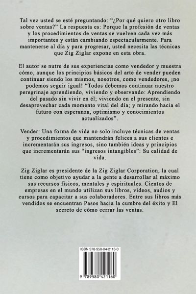 Tal vez usted se esté preguntando: "¿Por qué quiero otro libro sobre ventas?" La respuesta es: Porque la profesión de ventas y los procedimientos de ventas se vuelven cada vez más importantes y están cambiando espectacularmente. Para mantenerse al día y para progresar, usted necesita las técnicas que Zig Ziglar expone en esta obra. El autor se nutre de sus experiencias como vendedor y muestra cómo, aunque los principios básicos del arte de vender pueden continuar siendo los mismos, nosotros, como vendedores, ¡no podemos seguir igual! "Todos debemos continuar nuestro peregrinaje aprendiendo, viviendo y observando: Aprendiendo del pasado sin vivir en él; viviendo en el presente, sin desaprovechar cada momento vital del día; y mirando hacia el futuro con esperanza, optimismo y conocimientos actualizados". Vender: Una forma de vida no solo incluye técnicas de ventas y procedimientos que mantendrán felices a sus clientes e incrementarán sus ingresos, sino también ideas y principios que incrementarán sus "ingresos intangibles": Su calidad de vida. Zig Ziglar es presidente de la Zig Ziglar Corporation, la cual tiene como objetivo ayudar a la gente a desarrollar al máximo sus recursos físicos, mentales y espirituales. Cientos de empresas en el mundo utilizan sus libros, videos, audios y cursos para capacitar a sus colaboradores. Entre sus libros más vendidos se encuentran Pasos hacia la cumbre del éxito y El secreto de cómo cerrar las ventas.