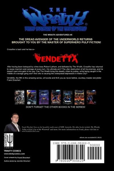 After having been betrayed by crime boss Robert Latham,and defeated by The Wraith, Crossfire has returned to cause mayhem and carnage at every turn. His ultimate aim? The utter destruction of all his enemies, and he doesn't care who gets in his way. Can The Wraith bring this deadly villain to justice, while being caught in the middle of a savage gang war? And who is causing the widespread depression in Metro City? Vendetta, #5 in this amazing series, will excite and thrill you as never before, courtesy master storyteller Frank Dirscherl.