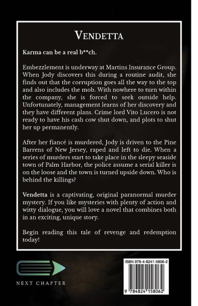 Karma can be a real b**ch. Embezzlement is underway at Martins Insurance Group. When Jody discovers this during a routine audit, she finds out that the corruption goes all the way to the top and also includes the mob. With nowhere to turn within the company, she is forced to seek outside help. Unfortunately, management learns of her discovery and they have different plans. Crime lord Vito Lucero is not ready to have his cash cow shut down, and plots to shut her up permanently. After her fiancé is murdered, Jody is driven to the Pine Barrens of New Jersey, raped and left to die. When a series of murders start to take place in the sleepy seaside town of Palm Harbor, the police assume a serial killer is on the loose and the town is turned upside down. Who is behind the killings? Vendetta is a captivating, original paranormal murder mystery. If you like mysteries with plenty of action and witty dialogue, you will love a novel that combines both in an exciting, unique story. Begin reading this tale of revenge and redemption today!