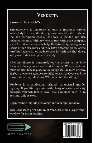 Karma can be a real b**ch. Embezzlement is underway at Martins Insurance Group. When Jody discovers this during a routine audit, she finds out that the corruption goes all the way to the top and also includes the mob. With nowhere to turn within the company, she is forced to seek outside help. Unfortunately, management learns of her discovery and they have different plans. Crime lord Vito Lucero is not ready to have his cash cow shut down, and plots to shut her up permanently. After her fiancé is murdered, Jody is driven to the Pine Barrens of New Jersey, raped and left to die. When a series of murders start to take place in the sleepy seaside town of Palm Harbor, the police assume a serial killer is on the loose and the town is turned upside down. Who is behind the killings? Vendetta is a captivating, original paranormal murder mystery. If you like mysteries with plenty of action and witty dialogue, you will love a novel that combines both in an exciting, unique story. Begin reading this tale of revenge and redemption today! This is the large print edition of Vendetta, with a larger font / typeface for easier reading.