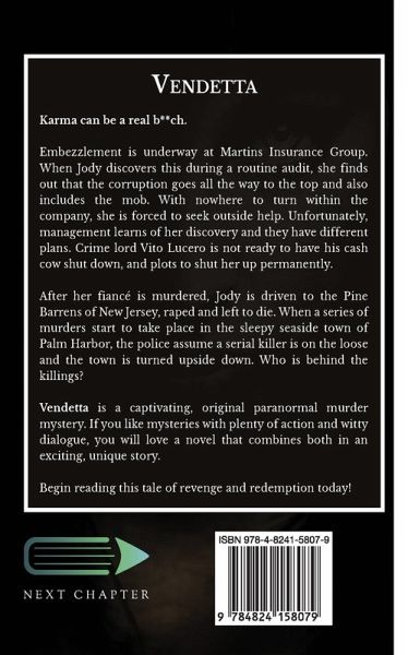 Karma can be a real b**ch. Embezzlement is underway at Martins Insurance Group. When Jody discovers this during a routine audit, she finds out that the corruption goes all the way to the top and also includes the mob. With nowhere to turn within the company, she is forced to seek outside help. Unfortunately, management learns of her discovery and they have different plans. Crime lord Vito Lucero is not ready to have his cash cow shut down, and plots to shut her up permanently. After her fiancé is murdered, Jody is driven to the Pine Barrens of New Jersey, raped and left to die. When a series of murders start to take place in the sleepy seaside town of Palm Harbor, the police assume a serial killer is on the loose and the town is turned upside down. Who is behind the killings? Vendetta is a captivating, original paranormal murder mystery. If you like mysteries with plenty of action and witty dialogue, you will love a novel that combines both in an exciting, unique story. Begin reading this tale of revenge and redemption today!