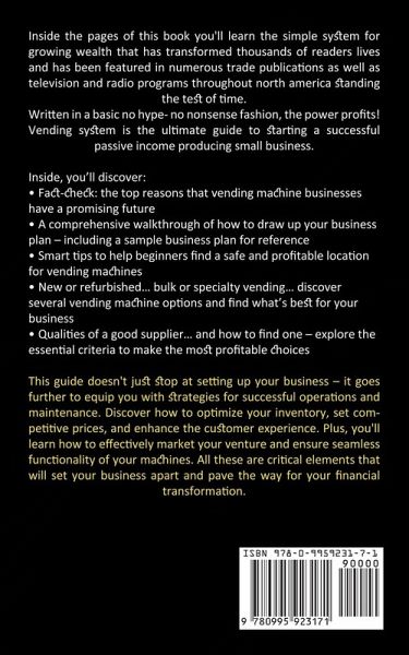 Inside the pages of this book you'll learn the simple system for growing wealth that has transformed thousands of readers lives and has been featured in numerous trade publications as well as television and radio programs throughout north america standing the test of time. Written in a basic no hype- no nonsense fashion, the power profits! Vending system is the ultimate guide to starting a successful passive income producing small business Inside, you'll discover:Fact-check: the top reasons that vending machine businesses have a promising future A comprehensive walkthrough of how to draw up your business plan - including a sample business plan for reference Smart tips to help beginners find a safe and profitable location for vending machines New or refurbished... bulk or specialty vending... discover several vending machine options and find what's best for your business Qualities of a good supplier... and how to find one - explore the essential criteria to make the most profitable choices This guide doesn't just stop at setting up your business - it goes further to equip you with strategies for successful operations and maintenance. Discover how to optimize your inventory, set competitive prices, and enhance the customer experience. Plus, you'll learn how to effectively market your venture and ensure seamless functionality of your machines. All these are critical elements that will set your business apart and pave the way for your financial transformation.