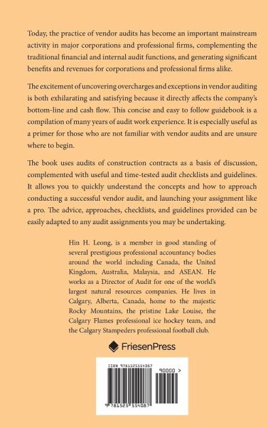 Today, the practice of vendor audits has become an important mainstream activity in major corporations and professional firms, complementing the traditional financial and internal audit functions, and generating significant benefits and revenues for corporations and professional firms alike. The excitement of uncovering overcharges and exceptions in vendor auditing is both exhilarating and satisfying because it directly affects the company's bottom-line and cash flow. This concise and easy to follow guidebook is a compilation of many years of audit work experience. It is especially useful as a primer for those who are not familiar with vendor audits and are unsure where to begin. The book uses audits of construction contracts as a basis of discussion, complemented with useful and time-tested audit checklists and guidelines. It allows you to quickly understand the concepts and how to approach conducting a successful vendor audit, and launching your assignment like a pro. The advice, approaches, checklists, and guidelines provided can be easily adapted to any audit assignments you may be undertaking.