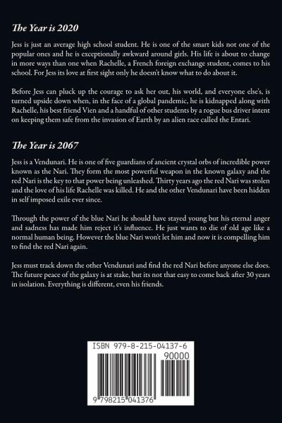 The Year is 2020 Jess is just an average high school student. He is one of the smart kids not one of the popular ones and he is exceptionally awkward around girls. His life is about to change in more ways than one when Rachelle, a French foreign exchange student, comes to his school. For Jess its love at first sight only he doesn't know what to do about it. Before Jess can pluck up the courage to ask her out, his world, and everyone else's, is turned upside down when, in the face of a global pandemic, he is kidnapped along with Rachelle, his best friend Vien and a handful of other students by a rogue bus driver intent on keeping them safe from the invasion of Earth by an alien race called the Entari. The Year is 2067 Jess is a Vendunari. He is one of five guardians of ancient crystal orbs of incredible power known as the Nari. They form the most powerful weapon in the known galaxy and the red Nari is the key to that power being unleashed. Thirty years ago the red Nari was stolen and the love of his life Rachelle was killed. He and the other Vendunari have been hidden in self imposed exile ever since. Through the power of the blue Nari he should have stayed young but his eternal anger and sadness has made him reject it's influence. He just wants to die of old age like a normal human being. However the blue Nari won't let him and now it is compelling him to find the red Nari again. Jess must track down the other Vendunari and find the red Nari before anyone else does. Future peace across the galaxy is at stake but it's not that easy to come back after 30 years in isolation. Everything is different, even his friends.