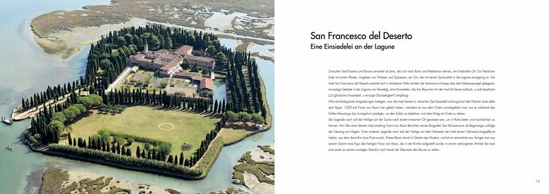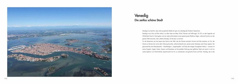 Venedig aus der Luft, eine außergewöhnliche Fotoreportage von Riccardo Roiter Rigoni , entstand im Lauf von fünf Jahren und regelmäßigen Helikopterflügen über die Lagunenstadt. Gemeinsam mit Debora Gusson fing der Fotograf nicht nur die Stadt Venedig selbst aus der Luft ein, sondern ebenso alle Inseln der einzigartigen Lagune - von Torcello über Murano bis Burano selbstverständlich, doch darüber hinaus auch das idyllische Eiland San Francesco del Deserto, die Verteidigungsanlagen der südlichen Lagune, den Lido und Pellestrina sowie all die anderen noch unberührten größeren und kleineren Inseln eines der schönsten Orte der Welt .