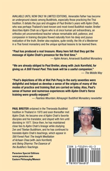 Available until now only in limited editions, "Venerable Father" has become an underground classic among Buddhists, especially those practicing the Thai tradition. It details the joys and struggles of Paul Breiter's years with Ajahn Chah, who was perhaps Thailand¿s best-known and most-loved Buddhist master. Breiter describes Ajahn Chah as a figure who is at once human yet extraordinary, an orthodox yet unconventional teacher whose remarkable skill, patience, and compassion in training disciples flowed naturally from his deep and joyous realization of the truth. Breiter also explains, quite vividly, the life of a Westerner in a Thai forest monastery and the unique spiritual lessons to be learned there. PAUL BREITER ordained in the Theravada Buddhist tradition in Thailand in 1970 and soon thereafter met Ajahn Chah. He became one of Ajahn Chah's favorite disciples and his translator, and stayed with him until disrobing in 1977. Since then, he has maintained close ties to Ajahn Chah's lineage while studying Zen and Tibetan Buddhism, and he has continued to translate Ajahn Chah's teachings, which appear in "Still Forest Pool: The Insight Meditation of Achaan Chaa" (with Jack Kornfield) and "Being Dharma: The Essence of the Buddhäs Teachings".