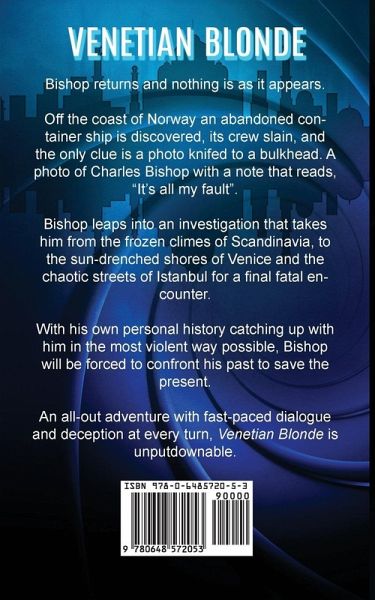 Bishop returns and nothing is as it appears. Off the coast of Norway an abandoned container ship is discovered, its crew slain, and the only clue is a photo knifed to a bulkhead. A photo of Charles Bishop with a note that reads, "It's all my fault". Bishop leaps into an investigation that takes him from the frozen climes of Scandinavia, to the sun-drenched shores of Venice and the chaotic streets of Istanbul for a final fatal encounter. With his own personal history catching up with him in the most violent way possible, Bishop will be forced to confront his past to save the present. An all-out adventure with fast-paced dialogue, with deception at every turn, Venetian Blonde is unputdownable.