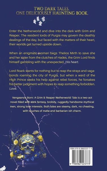 Two Dark Tales. One deliciously haunting book. Enter the Netherworld and dive into the dark with Grim and Reaper. The resident lords of Purgia may govern the deathly dealings of the day, but faced with the matters of their heart, their worlds get turned upside down. When an enigmatic woman begs Thelios Mirth to save she and her sister from the clutches of Hades, the Grim Lord finds himself gambling with the unexpected. His heart. Lord Roark wants for nothing but to reap the strays and vagabonds roaming the city of Purgia, but when a ward of the High Prince seeks his help against rebel forces, he forsakes his better judgment with hopes to reap something forbidden. Love. Vengeance Born: A Grim & Reaper Netherworld Tale is a two-act novel filled with dark fantasy, broody, ruggedly handsome mythical men, strong love interests. Both tales are steamy, dark, no cheating, with touches of mafia and barbarian-ish charm. Readers of the Fire duet, Fire Kissed & Fire Born will be happy to see Grim & Reaper again, while newbies get to dive head-first in an interconnected, yet standalone book. Author Note: Mature content. Suitable for ages 18+. Contains sexual situations, pillow talk, violence among supernatural creatures, discussions of death and morbidity and some gore. Ebooks will be emailed via Bookfunnel using the email address provided at purchase. See included FAQ for additional ebook delivery information.