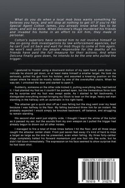 What do you do when a local mob boss wants something he believes you have, and will stop at nothing to get it? If you're FBI Special Agent Colton James, you already know what has to be done, and will be done. When Delcona's thugs murdered his friends and invaded his home in an effort to kill him, they made it personal. Colton's superiors have ordered him to not involve himself in the on-going mob investigations by law enforcement agencies, but he can't just sit back and wait for mob thugs to come at him again. He won't rest until the people responsible for the deaths of his friends have paid the full measure for their actions. And when Delcona finally goes down, he intends to be the one who pulled the trigger. Colt knows he can't count on any support from the Bureau, so the only answer might be to take a temporary leave of absence. The big question is: how do you exact vengeance with several different government agencies keeping the Delcona mob under round-the-clock surveillance.