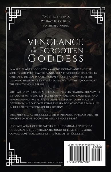 In a realm where gods walk among mortals and ancient secrets whisper from the sands, Rhea is a goddess haunted by grief and driven by guilt. Forever running away from the looming shadow of death, Rhea knows it's time to confront the very thing she fears. With allies by her side and enemies in every shadow, Rhea's path is fraught with epic battles, heart-wrenching sacrifices, and mind-bending twists. As she delves deeper into the maze of deception, she discovers that the key to saving the realms lies in her ability to embrace her destiny. Will Rhea rise as the goddess she is intended to be, or will the ancient darkness consume all she holds dear? Discover a tale of epic battles, the indomitable spirit of a goddess, and the unbreakable bonds of love in the series conclusion "Vengeance of the Forgotten Goddess."