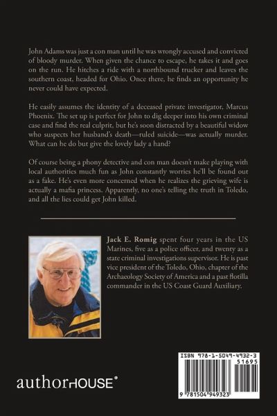 John Adams was just a con man until he was wrongly accused and convicted of bloody murder. When given the chance to escape, he takes it and goes on the run. He hitches a ride with a northbound trucker and leaves the southern coast, headed for Ohio. Once there, he finds an opportunity he never could have expected. He easily assumes the identity of a deceased private investigator, Marcus Phoenix. The set up is perfect for John to dig deeper into his own criminal case and find the real culprit, but he's soon distracted by a beautiful widow who suspects her husband's death-ruled suicide-was actually murder. What can he do but give the lovely lady a hand? Of course being a phony detective and con man doesn't make playing with local authorities much fun as John constantly worries he'll be found out as a fake. He's even more concerned when he realizes the grieving wife is actually a mafia princess. Apparently, no one's telling the truth in Toledo, and all the lies could get John killed.