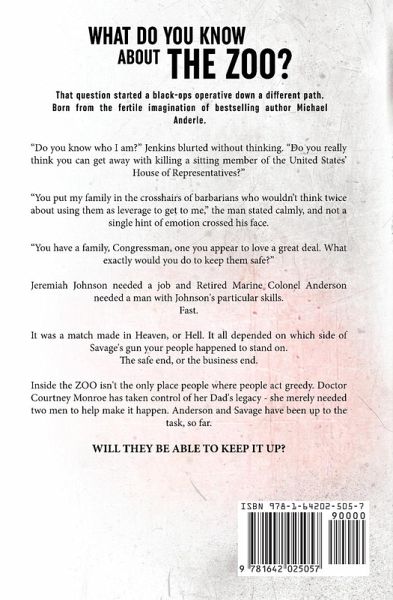 "What do you know about the ZOO?" That question started a black-ops operative down a different path. Born from the fertile imagination of bestselling author Michael Anderle. "Do you know who I am?" Jenkins blurted without thinking. "Do you really think you can get away with killing a sitting member of the United States' House of Representatives?" "You put my family in the crosshairs of barbarians who wouldn't think twice about using them as leverage to get to me," the man stated calmly, and not a single hint of emotion crossed his face. "You have a family, Congressman, one you appear to love a great deal. What exactly would you do to keep them safe?" Jeremiah Johnson needed a job and Retired Marine Colonel Anderson needed a man with Johnson's particular skills. Fast. It was a match made in Heaven, or Hell. It all depended on which side of Savage's gun your people happened to stand on. The safe end, or the business end. Inside the ZOO isn't the only place people where people act greedy. Doctor Courtney Monroe has taken control of her Dad's legacy - she merely needed two men to help make it happen. Anderson and Savage have been up to the task, so far. WILL THEY BE ABLE TO KEEP IT UP? Go up and click on the 'Read Now' button and enter a knock-down drag-out story where the last man standing is the one who rights the wrongs. Or at least the one who writes the story in the history books.