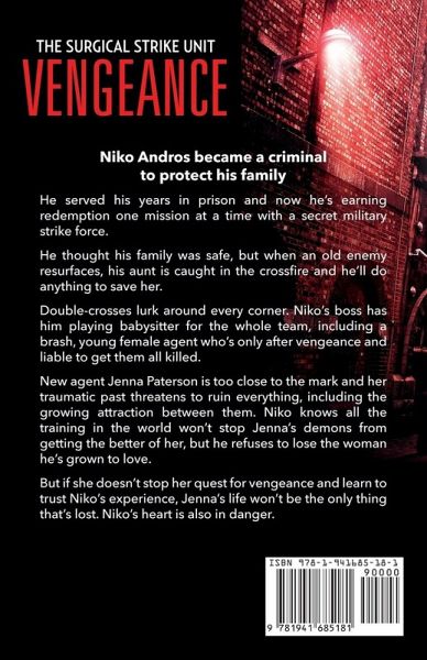 Niko Andros became a criminal to protect his family. He served his years in prison and now he's earning redemption one mission at a time with a secret military strike force. He thought his family was safe, but when an old enemy resurfaces, his aunt is caught in the crossfire and he'll do anything to save her. Double-crosses lurk around every corner. Niko's boss has him playing babysitter for the whole team, including a brash, young female agent who's only after vengeance and liable to get them all killed. New agent Jenna Paterson is too close to the mark and her traumatic past threatens to ruin everything, including the growing attraction between them. Niko knows all the training in the world won't stop Jenna's demons from getting the better of her, but he refuses to lose the woman he's grown to love. But if she doesn't stop her quest for vengeance and learn to trust Niko's experience, Jenna's life won't be the only thing that's lost. Niko's heart is also in danger. If you like gritty, edge-of-your-seat action, international intrigue, and characters forced to confront the darkness within themselves, then you'll love the first book in Vanessa Kier's action-packed SSU romantic thriller series. ¿Get Vengeance today to begin the adventure!
