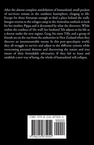 After the almost complete annihilation of humankind, small pockets of survivors remain in the southern hemisphere, clinging to life. Except for those fortunate enough to find a place behind the walls. Imogen returns to the refugee camp in the Australian outback to look for her mother, Pippa and is devastated by what she discovers. While within the confines of 'the wall', her husband Teb adjusts to his life as a doctor under the new regime. Greg, his sister Tilly, and a group of friends are on the run from the authorities in New Zealand when they discover an insurmountable enemy. In this post-apocalyptic world, they all struggle to survive and adjust to the different systems while overcoming personal demons and discovering the nature and true intent of their formidable adversaries. If they fail to learn and establish a new way of being, the whole of humankind will collapse.