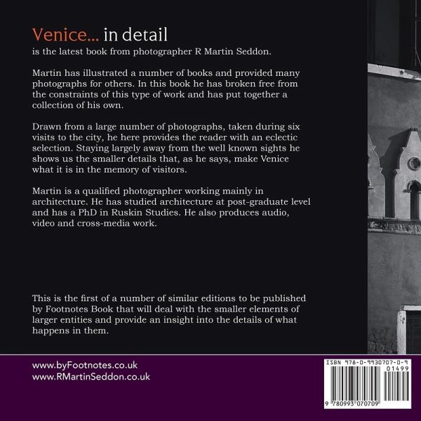 A collection of photographs of the smaller details of Venice. Although the major tourist sights are well known it is the smaller, less obvious features that give a place its distinctive feel. These images help the reader to reproduce that atmosphere to re-live a past visit or prepare for their next. With a foreword by the renowned Venetian architect, writer and broadcaster, Francesco da Mosto.