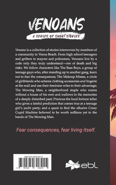 Venoans is a collection of stories interwoven by members of a community in Venoa Beach. From high school teenagers and grifters to mayors and policemen, Venoans live by a code only they truly understand-one of death and big risks. We follow characters like The Bass Boys, a group of teenage guys who, after standing up to another gang, learn not to fear the consequences; The Makeup Misses, a circle of girlfriends who scheme clothing accessories and lingerie at the mall and use their feminine wiles to their advantage; The Mowing Man, a neighborhood staple who roams without a house of his own and wallows in the memories of a deeply disturbed past; Precious the local fortune teller who gives a fateful prediction that comes true at a teenage girl's yacht party; and a quest to find the allusive Crazy Cupid Machine believed to be worth millions yet in the hands of The Mowing Man.
