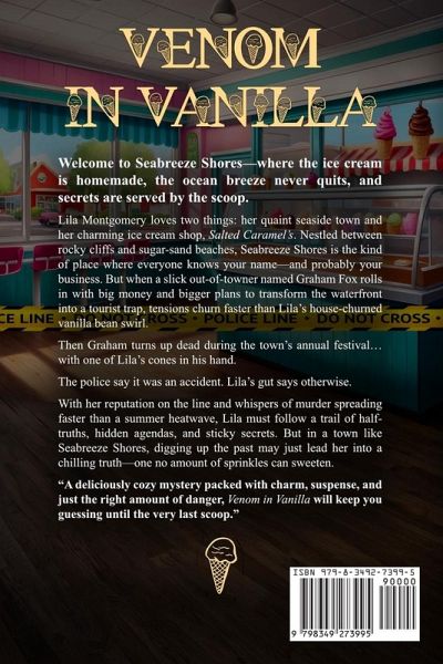 Welcome to Seabreeze Shores-where the ice cream is homemade, the ocean breeze never quits, and secrets are served by the scoop. Lila Montgomery loves two things: her quaint seaside town and her charming ice cream shop, Salted Caramel's. Nestled between rocky cliffs and sugar-sand beaches, Seabreeze Shores is the kind of place where everyone knows your name-and probably your business. But when a slick out-of-towner named Graham Fox rolls in with big money and bigger plans to transform the waterfront into a tourist trap, tensions churn faster than Lila's house-churned vanilla bean swirl. Then Graham turns up dead during the town's annual festival... with one of Lila's cones in his hand. The police say it was an accident. Lila's gut says otherwise. With her reputation on the line and whispers of murder spreading faster than a summer heatwave, Lila must follow a trail of half-truths, hidden agendas, and sticky secrets. But in a town like Seabreeze Shores, digging up the past may just lead her into a chilling truth-one no amount of sprinkles can sweeten. A deliciously cozy mystery packed with charm, suspense, and just the right amount of danger, Venom in Vanilla will keep you guessing until the very last scoop.