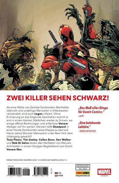 ZWEI KILLER SEHEN SCHWARZ! Als eine Welle von Zombie-Symbionten Manhattan überrollt und unzählige Menschen in Killerbestien verwandelt, wird auch Logan infiziert. Ohne Erinnerung an das folgende Geschehen kommt er erst in einem kleinen Städtchen wieder zu Sinnen, wo einige offene Rechnungen und willenlose Venom- Ableger auf ihn warten. Derweil reißt Deadpool in einer Horde Zombionten seine Klappe zu weit auf. Hat er damit Monster Metropolis unter New York dem Untergang geweiht? Tony Fleecs, Tim Seeley, Cullen Bunn, Kev Walker und Rob Di Salvo testen den Heilfaktor von Marvels Antihelden in einem blutigen Begleitband zum Event Venom War. ENTHÄLT: VENOM WAR: WOLVERINE (2024) 1-3 & VENOM WAR: DEADPOOL (2024) 1-3
