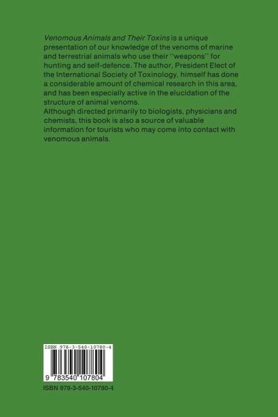 Venomous Animals have been a threat to man at all times, in the warm and wilder regions more than in the temperate areas. People in especially dangerous regions know about these risks and live accordingly. However, with modern tourism and nearly unlimited travel oppor tunities more and more people without experience and knowledge about venomous animals come into contact with them; this book is intended to provide these people with an introduction to the subject. Venomous animals, their habits, their whole ecology and their venoms have been the object or research since the beginning of this century; truly intensive work, how ever, first started about thirty years ago. Medical treat ment therefore has been changed by new insights in the mechanism of action and the constituents of the various venoms. In this regard this book is also directed to physi cians, biologists and chemists to give them an introduc tion in this important and interesting field. New aspects of treatment of envenomations are reported. This book cannot replace bigger textbooks and monographs - they are cited in the references - but it gives an overview and an entry into this field. The original German edition was written at the request of colleagues and students of medicine, biology and chemistry as well as frequent travellers in tropical countries. It was sold out within eight months, thus showing that it really filled a gap.