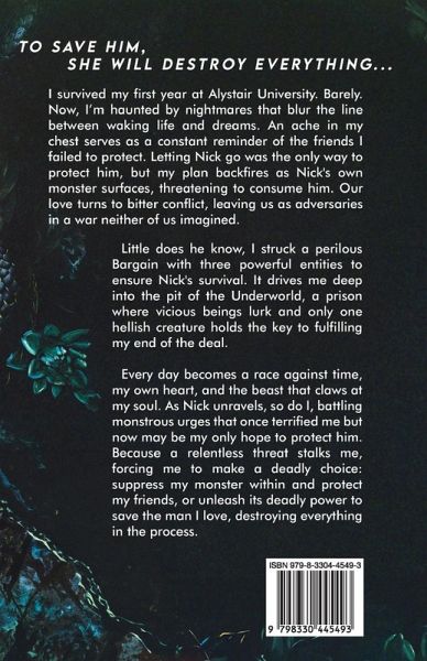 To save him, she will destroy everything... I survived my first year at Alystair University. Barely. Now, I'm haunted by nightmares that blur the line between waking life and dreams. An ache in my chest serves as a constant reminder of the friends I failed to protect. Letting Nick go was the only way to protect him, but my plan backfires as Nick's own monster surfaces, threatening to consume him. Our love turns to bitter conflict, leaving us as adversaries in a war neither of us imagined. Little does he know, I struck a perilous Bargain with three powerful entities to ensure Nick's survival. It drives me deep into the pit of the Underworld, a prison where vicious beings lurk and only one hellish creature holds the key to fulfilling my end of the deal. Every day becomes a race against time, my own heart, and the beast that claws at my soul. As Nick unravels, so do I, battling monstrous urges that once terrified me but now may be my only hope to protect him. Because a relentless threat stalks me, forcing me to make a deadly choice: suppress my monster within and protect my friends, or unleash its deadly power to save the man I love, destroying everything in the process.