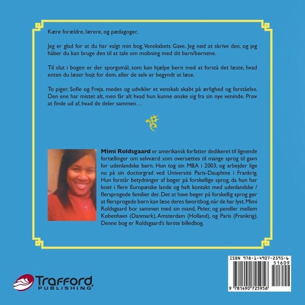 Kære forældre, lærere, og pædagoger, Jeg er glad for at du har valgt min bog, Venskabets Gave. Jeg nød at skrive den, og jeg håber du kan bruge den til at tale om mobning med dit barn/børnene. Til slut i bogen er der sporgsmål, som kan hjælpe børn med at forstå det læste, hvad enten du læser hojt for dem, eller de selv er begyndt at læse. To piger, Sofie og Freja, mødes og udvikler et venskab skabt på ærlighed og forståelse. Den ene har mistet alt, men får alt hvad hun kunne ønske sig fra sin nye veninde. Prøv at finde ud af, hvad de deler sammen...