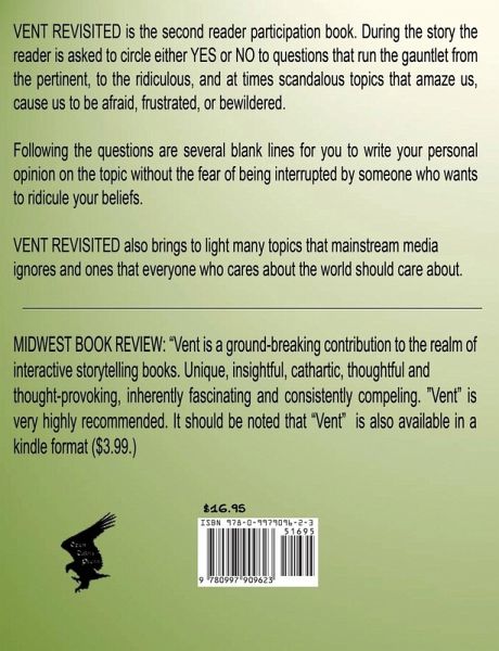 VENT REVISITED is the second ever reader participation book continuing the story about two friend’s heartwarming relationship.The reader is asked to circle YES or NO questions that range from the utterly ridiculous to the pertinent and controversial topics that seem to leave our brains in a constant state of frustration. The questions are followed by several blank lines so you can write your personal opinion without being rudely interrupted - groundbreaking, hilariously funny and also deeply serious, definitely not politically correct. Stress relief through the written word.