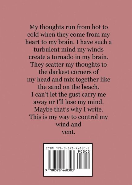 My thoughts run from hot to cold when they come from my heart to my brain. I have such a turbulent mind my winds create a tornado in my brain. They scatter my thoughts to the darkest corners of my head and mix together like the sand on the beach. I can't let the gust carry me away or I'll lose my mind. Maybe that's why I write. This is my way to control my wind and vent.