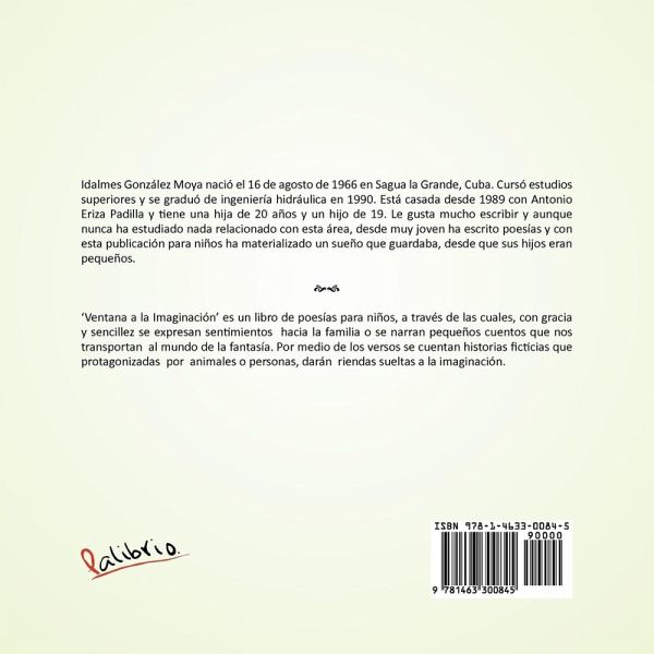 Ventana a la Imaginación' es un libro de poesías para niños, a través de las cuales, con gracia y sencillez se expresan senti mientos hacia la familia o se narran pequeños cuentos que nos transportan al mundo de la fantasía. Por medio de los versos se cuentan historias fi cti cias que protagonizadas por animales o personas, darán riendas sueltas a la imaginación.