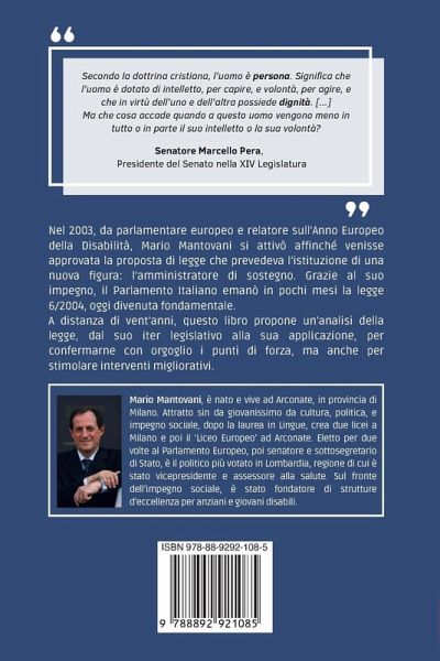 Secondo la dottrina cristiana, l'uomo è persona. Significa che l'uomo è dotato di intelletto, per capire, e volontà, per agire, e che in virtù dell'uno e dell'altra possiede dignità. [...] Ma che cosa accade quando a questo uomo vengono meno in tutto o in parte il suo intelletto o la sua volontà? (Senatore Marcello Pera, Presidente del Senato nella XIV Legislatura) Nel 2003, da parlamentare europeo e relatore sull'Anno Europeo della Disabilità, Mario Mantovani si attivò affinché venisse approvata la proposta di legge che prevedeva l'istituzione di una nuova figura: l'amministratore di sostegno. Grazie al suo impegno, il Parlamento Italiano emanò in pochi mesi la legge 6/2004, oggi divenuta fondamentale. A distanza di vent'anni, questo libro propone un'analisi della legge, dal suo iter legislativo alla sua applicazione, per confermarne con orgoglio i punti di forza, ma anche per stimolare interventi migliorativi.