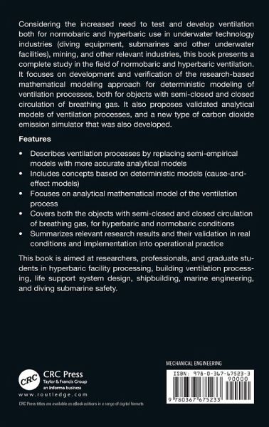 Considering the increased need to test and develop ventilation both for normobaric and hyperbaric use in underwater technology industries (diving equipment, submarines and other underwater facilities), mining, and other relevant industries, this book presents a complete study in the field of normobaric and hyperbaric ventilation. It focuses on development and verification of the research-based mathematical modeling approach for deterministic modeling of ventilation processes, both for objects with semi-closed and closed circulation of breathing gas. It also proposes validated analytical models of ventilation processes, and a new type of carbon dioxide emission simulator that was also developed. Features Describes ventilation processes by replacing semi-empirical models with more accurate analytical models. Includes concepts based on deterministic models (cause-and-effect models). Focuses on analytical mathematical model of the ventilation process. Covers both the objects with semi-closed and closed circulation of breathing gas, for hyperbaric and normobaric conditions. Summarizes relevant research results and their validation in real conditions and implemented into operational practice. This book is aimed at researchers, professionals, and graduate students in hyperbaric facility processing, building ventilation processing, life support system design, shipbuilding, marine engineering, and diving submarine safety.