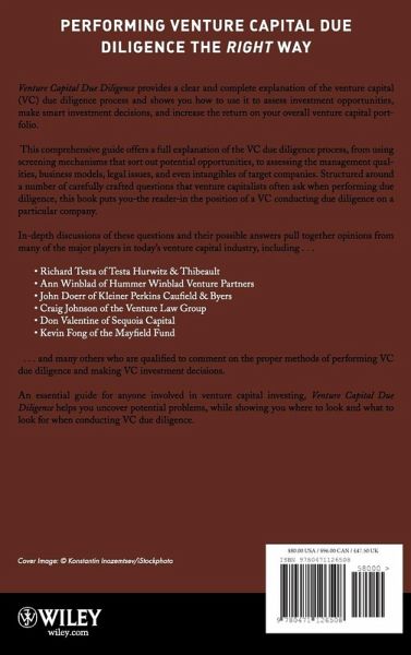 Due Diligence ist ein Prüfverfahren, mit dessen Hilfe Investoren die wirtschaftliche und finanzielle Situation des zu finanzierenden Unternehmens genau durchleuchten, um solide Investmententscheidungen zu treffen. "Venture Capital Due Diligence" ist ein praktischer Leitfaden zum Due Diligence Prozess. Er erläutert ausführlich das strenge Regelwerk dieses Prüfverfahrens und zeigt dem Leser, wie er diese Technik in der Praxis einsetzt, um damit Investmentchancen zu bewerten und die Rentabilität seiner Kapitalanlage (ROI - Return on Investment) einzuschätzen. Mit Tipps, Ratschlägen und Checklisten, die von den international erfolgreichsten Wagniskapitalgebern zusammengestellt wurden sowie einem Fragenkatalog, der die wichtigsten Kriterien des Due Diligence Prozesses beinhaltet. "Venture Capital Due Diligence" ist ein unentbehrlicher Ratgeber für alle Venture Capitalists, professionelle Investoren und Finanzgeber.