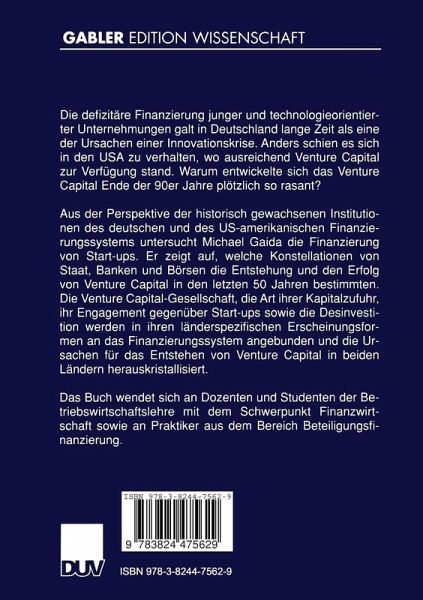 Aus der Perspektive der historisch gewachsenen Institutionen des deutschen und des US-amerikanischen Finanzierungssystems untersucht Michael Gaida die Finanzierung von Start-ups. Er zeigt auf, welche Konstellationen von Staat, Banken und Börsen die Entstehung und den Erfolg von Venture Capital in den letzten 50 Jahren bestimmten. Die Venture Capital-Gesellschaft, die Art ihrer Kapitalzufuhr, ihr Engagement gegenüber Start-ups sowie die Desinvestition werden in ihren länderspezifischen Erscheinungsformen an das Finanzierungssystem angebunden und die Ursachen für das Entstehen von Venture Capital in beiden Ländern herauskristallisiert.