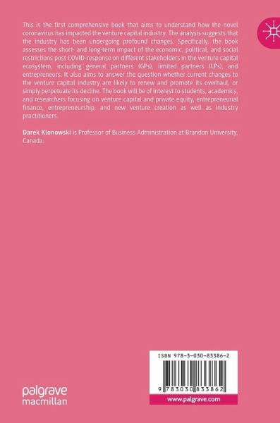 This is the first comprehensive book that aims to understand how the novel coronavirus has impacted the venture capital industry. The analysis suggests that the industry has been undergoing profound changes. Specifically, the book assesses the short- and long-term impact of the economic, political, and social restrictions post COVID-response on different stakeholders in the venture capital ecosystem, including general partners (GPs), limited partners (LPs), and entrepreneurs. It also aims to answer the question whether current changes to the venture capital industry are likely to renew and promote its overhaul, or simply perpetuate its decline. The book will be of interest to students, academics, and researchers focusing on venture capital and private equity, entrepreneurial finance, entrepreneurship, and new venture creation as well as industry practitioners