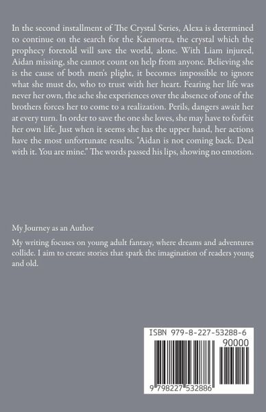The Crystal Series: Book Two She was chosen by prophecy. But destiny doesn't care who it breaks. Alexa thought she could handle the journey alone. With Liam injured and Aidan missing, she doesn't have a choice. The Kaemorra-the crystal that could save their world-is out there, and she's the only one left to find it. But guilt weighs heavy. She blames herself for what happened to both brothers-and for the feelings she can't ignore. Every step toward the truth brings new danger, new betrayal... and a growing fear that her fate was never hers to choose. Just when she thinks she's gaining control, everything falls apart. "Aidan is not coming back. Deal with it. You are mine." The words cut deeper than any blade. To save the one she loves, Alexa might have to lose everything-including herself.