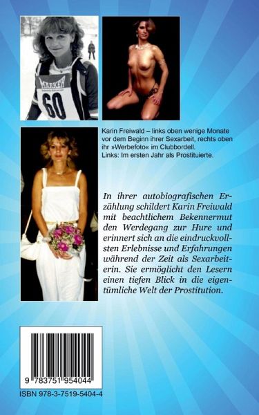 1958 in der Schweiz geboren, in Südafrika aufgewachsen und zur Schule gegangen und seit 1975 in Österreich lebend, wurde Karin Freiwald schon früh mit privaten Wechselfällen des Lebens konfrontiert, die auch ihren Anteil daran hatten, dass sie als hübsche und nicht unkluge junge Frau ziemlich orientierungslos in die Zukunft sah. Es gab Ansätze für eine solide Arbeitskarriere, doch die Verlockung, als Fotomodell in die schillernde Szene der Medienwelt einzutauchen, ließ das private und berufliche Fortkommen innerhalb einer normalen Bürgerlichkeit nicht mehr zu. Die "Schnupperstunden" vor der Kameralinse beschleunigten das Hineingleiten der unerfahrenen Karin in das Rotlichtmilieu. Elf Jahre war sie als hauptberufliche Prostituierte tätig und bot Tausenden Männern ihre sexuellen Dienstleistungen an. Trotz aller privaten und beruflichen Höhen und Tiefen während dieser dem Sex gewidmeten Zeit bedauert Karin Freiwald nicht, als Hure ihr Geld verdient zu haben, immerhin war dies eine außergewöhnliche Schule des Lebens, verbunden mit einer überaus attraktiven Verdienstperspektive. Karin Freiwald lebt heute im äußersten Westen Österreichs, nahe ihrem Geburtsland Schweiz