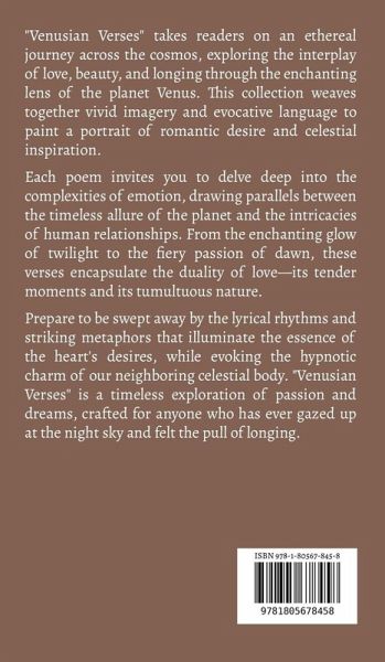 "Venusian Verses" takes readers on an ethereal journey across the cosmos, exploring the interplay of love, beauty, and longing through the enchanting lens of the planet Venus. This collection weaves together vivid imagery and evocative language to paint a portrait of romantic desire and celestial inspiration. Each poem invites you to delve deep into the complexities of emotion, drawing parallels between the timeless allure of the planet and the intricacies of human relationships. From the enchanting glow of twilight to the fiery passion of dawn, these verses encapsulate the duality of love-its…mehr